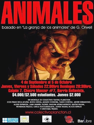 Colectivo Plancton crea esta obra basada en el libro "La Granja de los Animales", de George Orwell, con un gran despliegue de escenografía, 7 actrices y actores en escena, incorporando teatro de sombras, retro-proyecciones, una banda en vivo de 5 músicos y más de 15 máscaras para personificar a los animales en su camino a la humanización que los lleva a repetir el modelo. Recordando la gran frase final del libro;