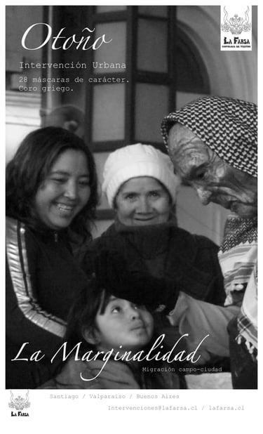 La marginalidad como tema principal de la intervención, las máscaras de anciana-anciano, en formación de coro griego amplifican el sentido de la imagen y de la gestualidad ocupada.